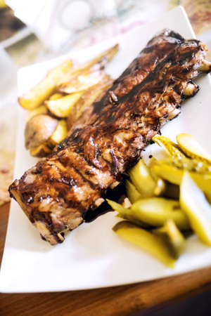 Pork spare ribs with barbecue sauce, golden potatoes and pickles. Main dish at restaurant, beef or pork delicacy