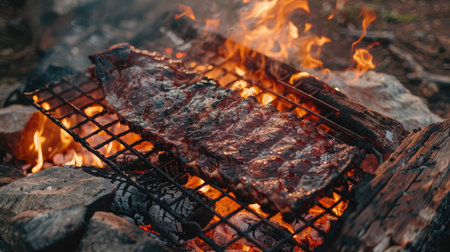 Sizzling barbecue ribs cooking on a grill with flames licking the surface, creating a smoky flavor and inviting aroma perfect for summer gatherings.