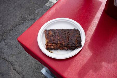 A paper plate of a half-rack barbecue ribs on a red picnic table at The Great New York State Fair.