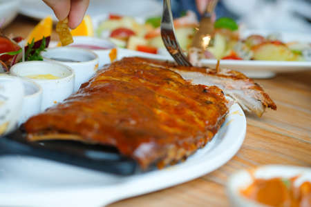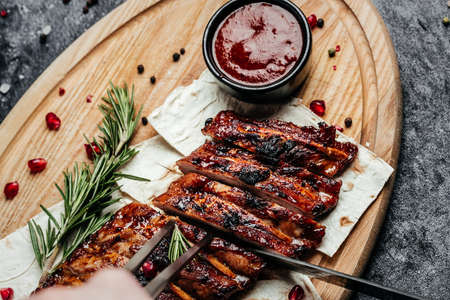 Smoked rib with barbecue sauce, Delicious appetizing dinner, Barbecue Pork Spare Ribs, Background image, copy space,