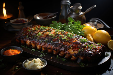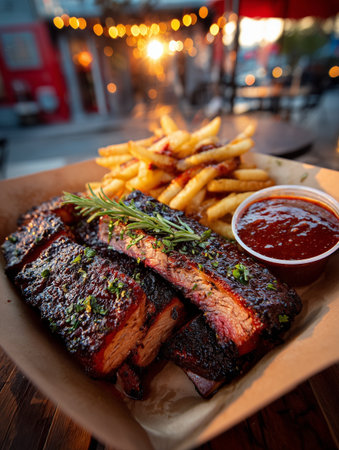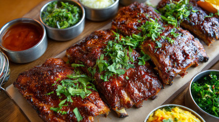 A tempting platter of barbecue ribs garnished with fresh herbs, served with flavorful sides and dipping sauces, ideal for gatherings or casual dining experiences.