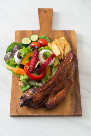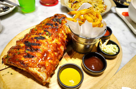 Grilled rib pork with barbecue sauce and vegetable and frech fries on wooden cutting board