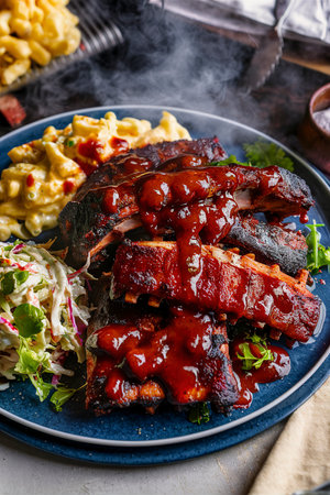 Grilled barbeque ribs with BBQ sauce with mac and cheese and coleslaw