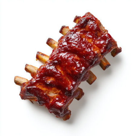 A single serving of barbecue pork ribs showcases a rich, sticky glaze on a light backdrop, perfect for culinary presentations, menus, and food photography.