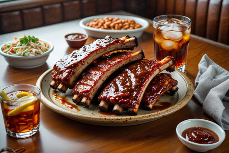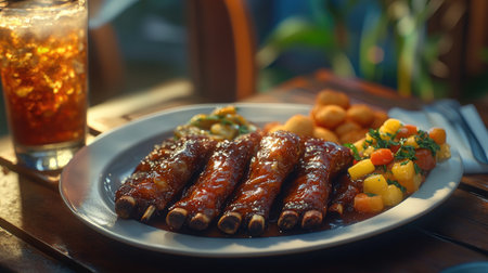 A casual dining scene with a plate of sticky pork ribs and sides, a glass of refreshing drink nearby, capturing the essence of comfort food and relaxation.