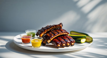 AI Generated. Grilled barbecue ribs served with zucchini and colorful dipping sauce on a plate