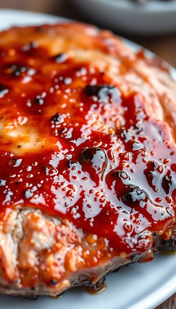 piece of meat covered in ketchup on a plate