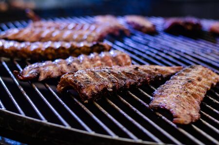 Close up of beef ribs on barbecue grill. Barbecue concept.