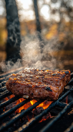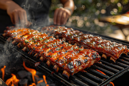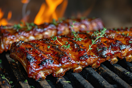 A close-up shot of juicy barbecue ribs grilling over flames, covered in rich sauce and surrounded by fragrant smoke, perfect for summer cookouts.