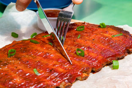 Man hand cutting pork spare ribs with knife and fork , ready to eat