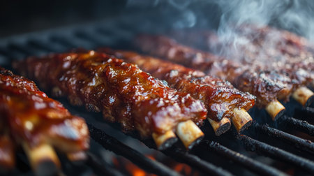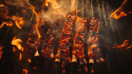 Juicy ribs cooking on a barbecue grill, surrounded by smoke and flames, creating a delicious outdoor dining experience perfect for summer gatherings.