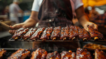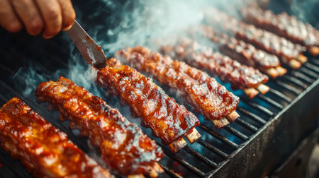 A barbecue chef tending to racks of sizzling pork ribs on a smoking grill, basting them with a flavorful marinade for maximum taste.