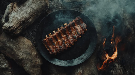 A succulent rack of grilled ribs sits on a black plate over glowing embers, exuding steam and smoky aromas, perfect for outdoor dining adventures.