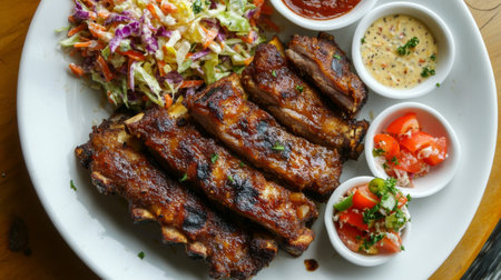 Indulge in this mouthwatering plate of barbecue ribs paired with fresh sides and dips. Perfect for gatherings or a satisfying meal experience.