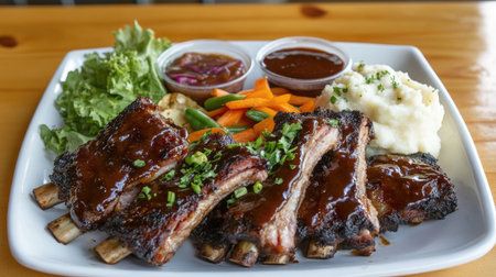 A platter of pork ribs served with dipping sauces, fresh vegetables, and a side of mashed potatoes, perfect for showcasing comfort food at its best.