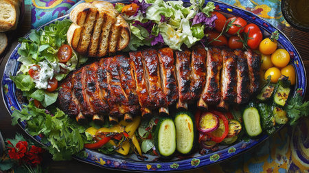 A colorful presentation of grilled pork ribs with a variety of sides, including fresh salad, garlic bread, and pickles, arranged attractively on a serving platter.