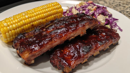 A delicious barbecue plate featuring ribs coated in a sticky glaze, served with corn on the cob and coleslaw, all arranged beautifully on a white plate.