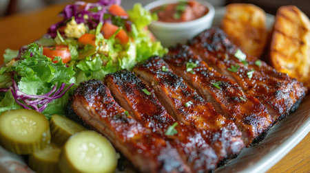 A mouthwatering plate featuring succulent barbecue ribs, fresh salad, and tangy pickles. Perfect for food lovers seeking vibrant flavors and textures.