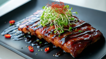 Mouthwatering grilled ribs coated in rich barbecue sauce, garnished with fresh herbs. Ideal for food lovers seeking delicious and savory meals. Perfect for dining.