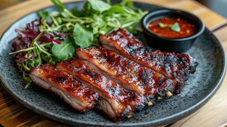 Enjoy a mouthwatering plate of barbeque ribs served with a vibrant salad, showcasing smoky flavors and rich sauce in a tempting presentation.