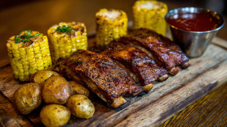 Indulge in a mouthwatering feast featuring tender barbecue ribs, sweet corn, and roasted potatoes, all beautifully arranged on a rustic wooden platter.