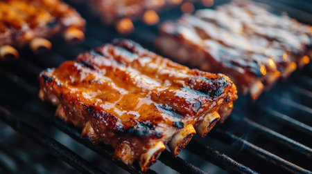 Close-up of juicy, barbecued ribs cooking on a grill, exuding steam and flavor. Perfect for showcasing outdoor cooking and delicious cuisine.