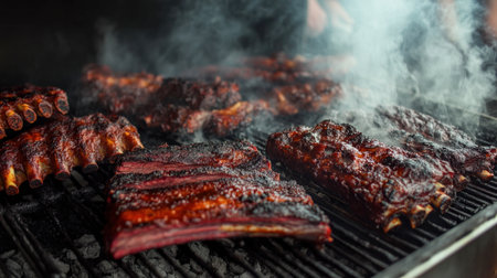 A barbecue smoker in action, with ribs and brisket slowly cooking over a bed of coals, releasing smoky aromas into the air.