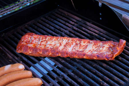 Pork loin ribs, near sausages, on a barbeque