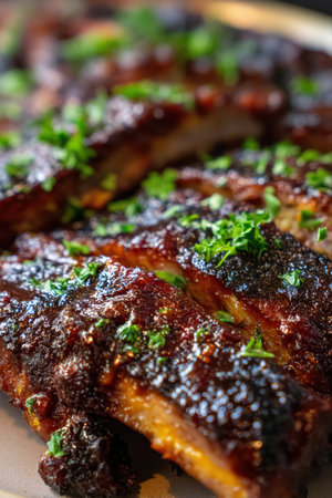 Gourmet ribs with a rich, thick glaze displaying a charred texture. garnished with fresh parsley, these ribs are perfect for culinary design and food presentations, offering a mouthwatering visual of succulent barbecue delights.