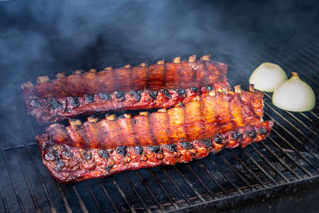 2 slabs of ribs sitting on smoker grill plates with visible smoke and onion halves in background