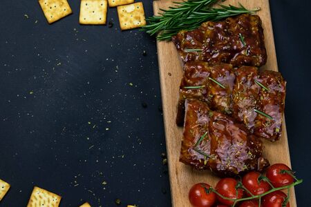 Closeup of pork ribs grilled with BBQ sauce and caramelized in honey. Tasty snack to beer on a wooden Board for filing on dark concrete background