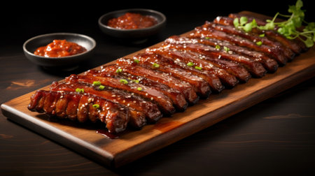 Wooden cutting board holding delicious ribs covered in BBQ sauce, A sticky-sweet rack of ribs ready to be devoured