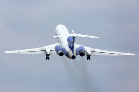 Russian jet Yakovlev Yak-40K - passenger three-engined jet airliner, commuter trijet in flight against blue sky clouds. Rear view of airplane. Tail number RA-87947. Kamchatka, Russia - Sep 13, 2019