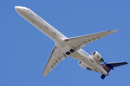Madrid, Spain; 09-25-2021: Mitsubishi CRJ-1000 model airplane, from Iberia Regional airline, seen with a low angle view shortly after taking off with a nice cloudy sky behind
