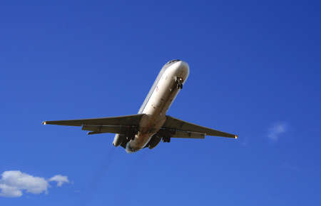 Flying commercial two engine airplane against clear blue sky. Passenger modern aircraft isolated on blue background.