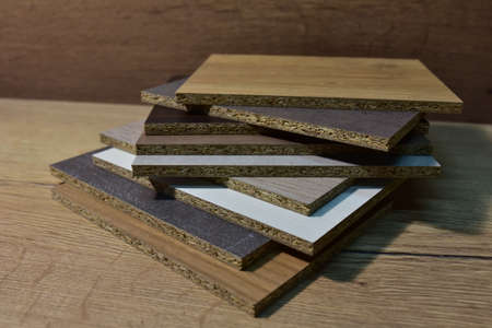 Edges of boards made of laminated chipboard, details of cabinet furniture in the assembly shop. Background with selective focus and copy space