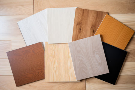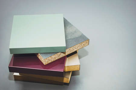 top view of interior finishing material combination samples of finishing material based on laminated chipboard and MDF