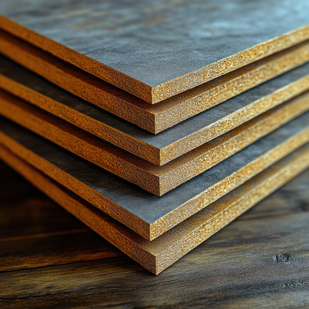 Close up of a particle board slab showing wood chip texture in an industrial setting with soft lighting.