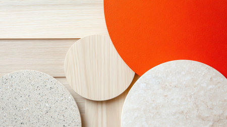 A captivating arrangement of circular figures showcases a blend of colors, including orange, white, and natural textures, reflecting artistic creativity and modern design.