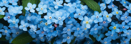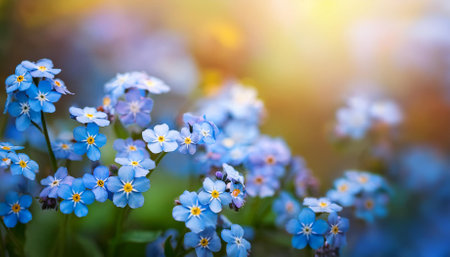 Spring or summer flowers landscape. Blue flowers of Myosotis or forget-me-not flower on sunny blurred background. selective soft focus. Banner