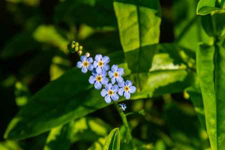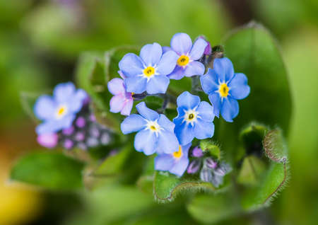 Water forget-me-not Myosotis scorpioides Myosotis palustris Myosotis flower tender flowers blossoming in spring time natural floral background. Forget-me-not flower macro with bright green leaves Blue