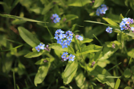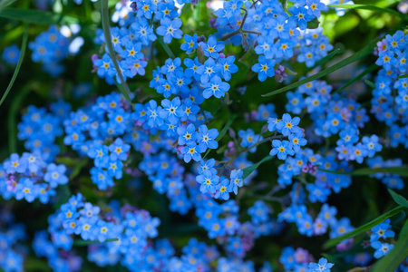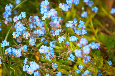 Beautiful forget-me-not (Myosotis scorpioides) flowers. Charming five-petaled blue blooms in spring. Flowering plants in the garden, flower bed. Native wildflowers in flowering garden. Plants care.