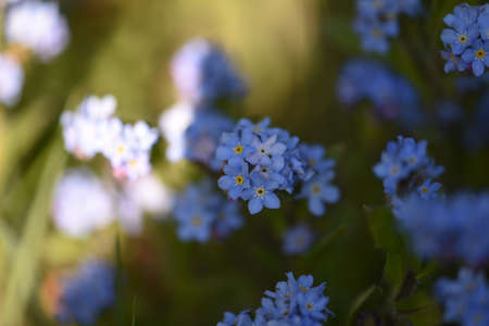 close-up of blue forget-me-not flowers outdoor in sunny backyard shot at shallow depth of field
