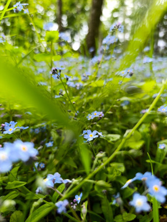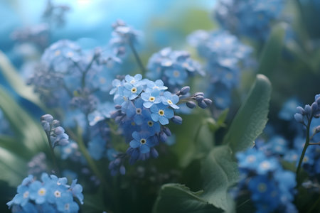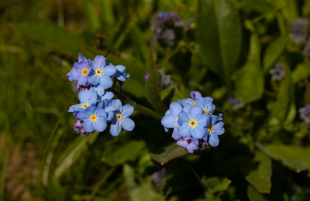 Beautiful, delicate blue forget-me-not flowers bloom in the summer twilight, creating a true work of nature's art. These wildflowers are a true delight to the eyes.
