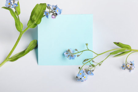 Blank card and beautiful forget-me-not flowers on white background, space for text