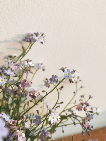 Vintage still life of forget-me-nots flowers. Gentle floral muted meadow flowers background.