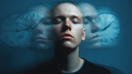 A person remains motionless while multiple clocks blur around them, capturing the feeling of time pressure in a hectic environment.
