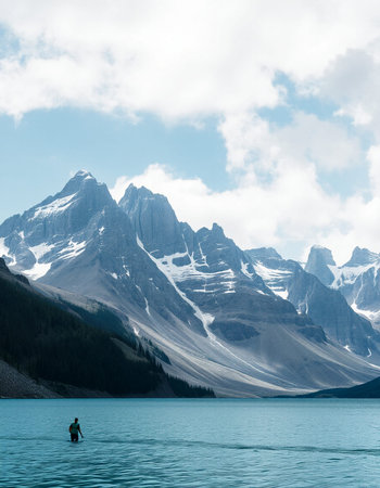 A beautiful view of a lake surrounded by snow-capped mountains in Canada