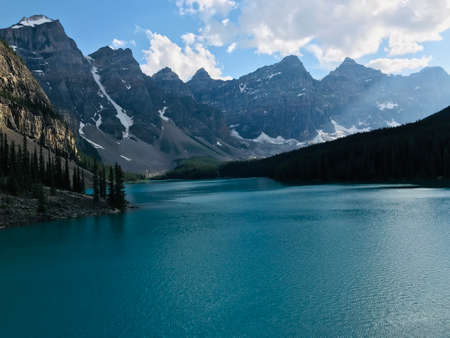 Sunrise with turquoise waters of the Moraine lake with sin lit rocky mountains in Banff National Park of Canada in Valley of the ten peaks.