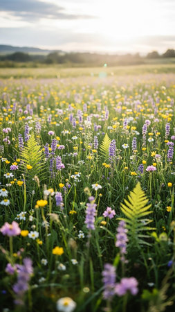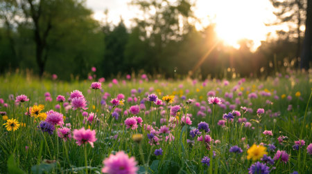 A breathtaking view of a vibrant wildflower field illuminated by warm sunset light. This stunning image captures the essence of nature's beauty and tranquility, perfect for outdoor and landscape photography enthusiasts.